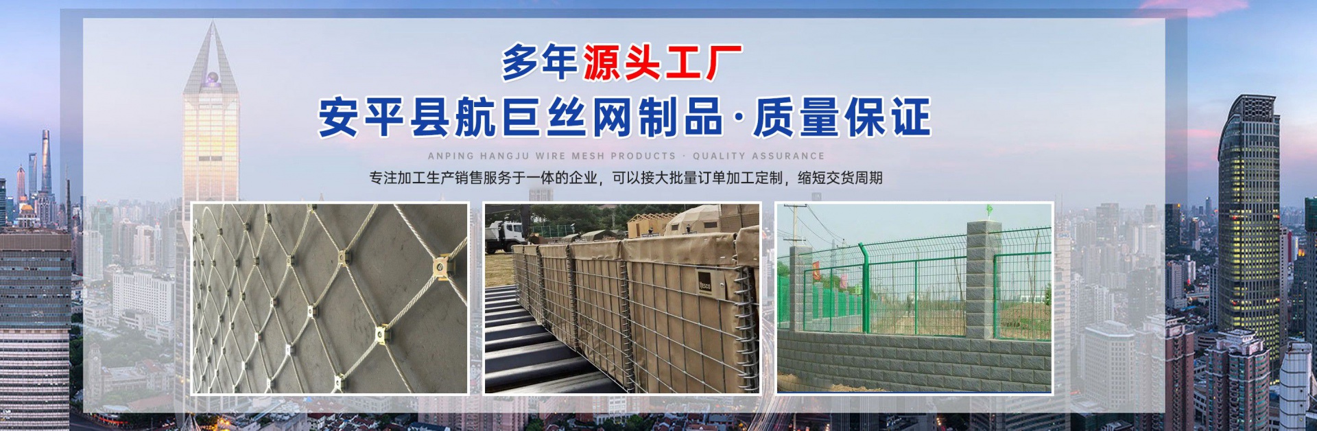 安平縣航巨絲網(wǎng)制品有限公司位于富有“絲網(wǎng)之鄉(xiāng)”美譽的—河北安平縣,此地是世界上最大的絲網(wǎng)集散基地,是華北平原上一顆璀璨的明珠。地處京、津、石三大城市中間,交通便利,是一家集生產(chǎn),加工,銷售為一體的大型絲網(wǎng)廠家。本廠專業(yè)生產(chǎn)各種類型的絲網(wǎng),類型齊全,主要包括:格賓石籠網(wǎng),雷諾護墊,麥克排水墊,加筋麥克墊,市政護欄,防爆籠,主動防護網(wǎng),被動防護網(wǎng),電焊網(wǎng)片,鋼格柵板等產(chǎn)品,形成了針對邊坡支護、基坑支護、山體邊坡綠化、鐵路、高速、公路、江河、堤壩及海塘的防沖刷保護以及水庫、河流截流等不同行業(yè)、不同規(guī)模、不同應(yīng)用的絲網(wǎng)產(chǎn)品和針對性解決方案,是國內(nèi)最有影響力的絲網(wǎng)產(chǎn)品供應(yīng)商。技術(shù)指標(biāo)達到國家同類產(chǎn)品標(biāo)準(zhǔn),可以接受較大的定單并保證質(zhì)量和生產(chǎn)期限。 公司始終堅持誠信為本、質(zhì)量第一、客戶至上的經(jīng)營理念,本著互惠互利的精神,希望與國內(nèi)外朋友共同合作,為您提供優(yōu)質(zhì)的產(chǎn)品和服務(wù)。我公司在創(chuàng)新管理中求發(fā)展、創(chuàng)新經(jīng)營中求生存。把企業(yè)標(biāo)準(zhǔn)化管理、定額管理、計劃管理,公司十分注重把握市場經(jīng)濟的信息脈絡(luò),用現(xiàn)代網(wǎng)絡(luò)技術(shù),以科研開發(fā)為原動力,與科技院校及相關(guān)專家密切合作,共同研制開發(fā)21世紀(jì)適用顧客需求的相關(guān)產(chǎn)品。 安平縣航巨絲網(wǎng)制品一直是以“質(zhì)量精良,交貨及時,價格合理,服務(wù)周到”的宗旨來為廣大客戶服務(wù);并且本著“質(zhì)...